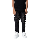SERENEDE® "KIDS POPPY" cargo jeans feature a washed black fabric with a skinny fit. Multiple cargo pockets with button fastening. Tactical and technical fabrication detail. Fading and whiskering throughout. Leather logo patch at back waistband. Zip-fly. Tonal stitching. SERENEDE® branded button and rivet hardware.